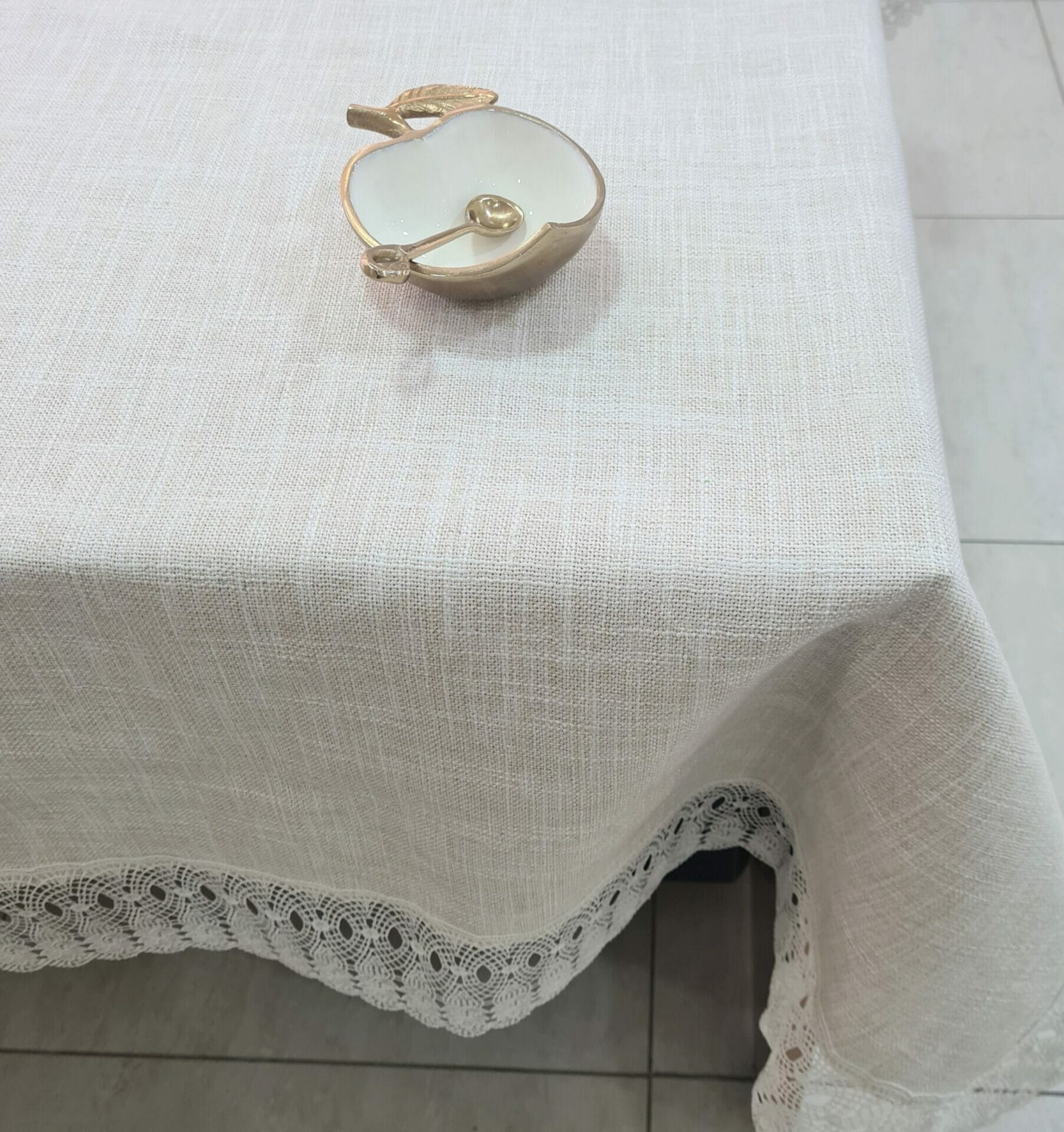 מפת שולחן דמוי פשתן עם תחרה, דוחה כתמים וללא צורך בגיהוץ.
